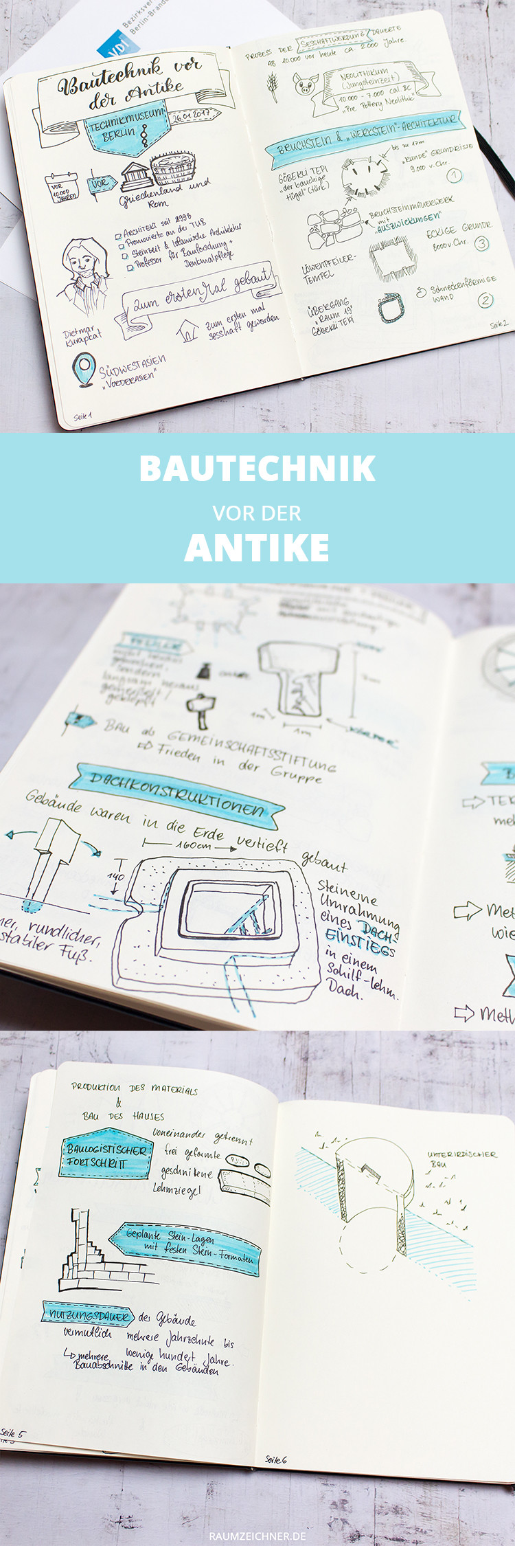 Meine letzte Sketchnote zum Thema Architektur entstand Ende Januar 2017 bei einem Vortrag vom VDI (Verein Deutscher Ingenieure) im Deutschen Technikmuseum Berlin. Die Sketchnote war für mich allein, ganz privat. Sie ziert nun mein Notizheft, wie so viele vor ihr es auch schon getan haben. Dort tummeln sich Sketchnotes zu den Themen Marketing, Baugeschichte, Design… Jedes Thema findet einen Platz. Meine ganz frühen Anfänge liegen noch in der Studienzeit. Während die meisten meiner Kommilitonen ihre Skripte mit Notizen verschönerten, habe ich meist auf weißen Seiten meine Mitschriften gemacht. Und dabei habe ich sehr viel gezeichnet.