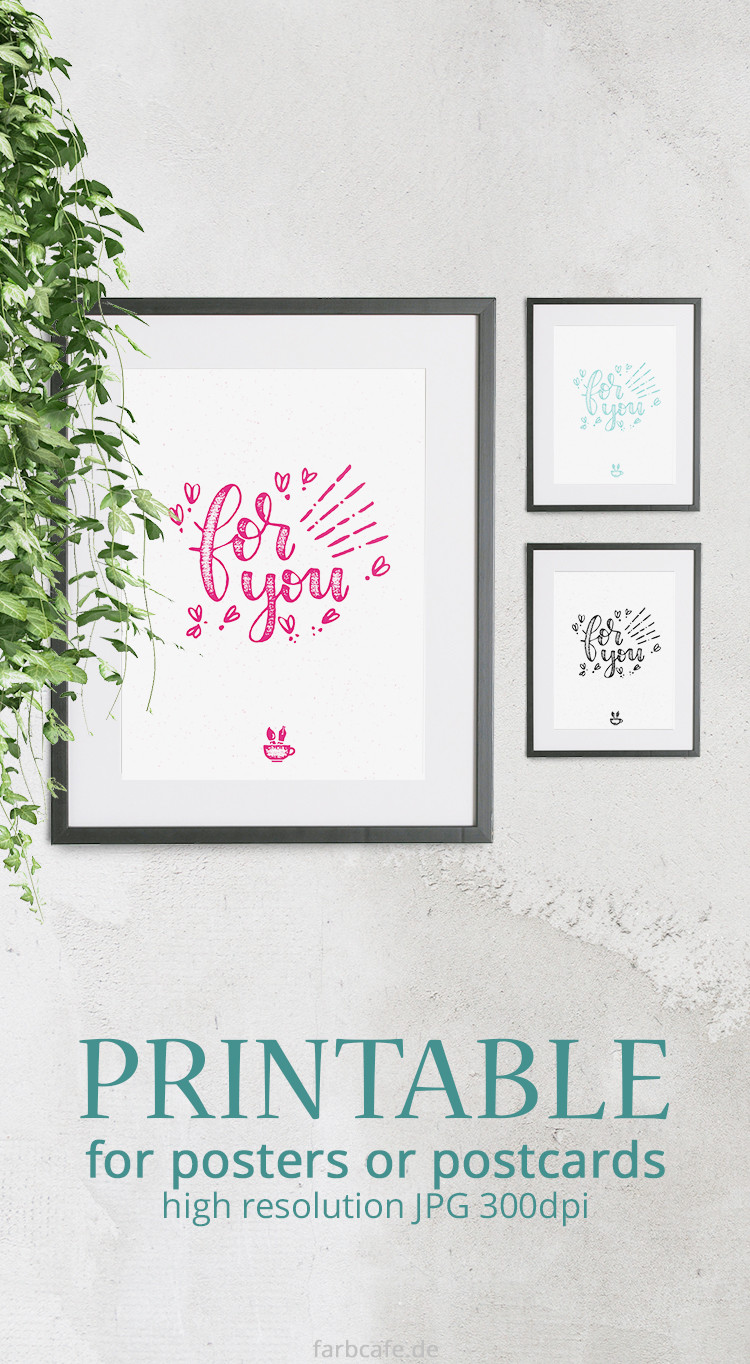 Das Lettering ist im Format Din A4 erstellt und mit einer Auflösung von 300dpi als JPG-Datei abgespeichert. Du kannst es direkt als Poster nutzen oder daraus Postkarten oder auch Geschenkanhänger erstellen. Drucke dazu das Bild einfach mehrfach auf einen Din A4 Bogen und schneide es anschließend aus!