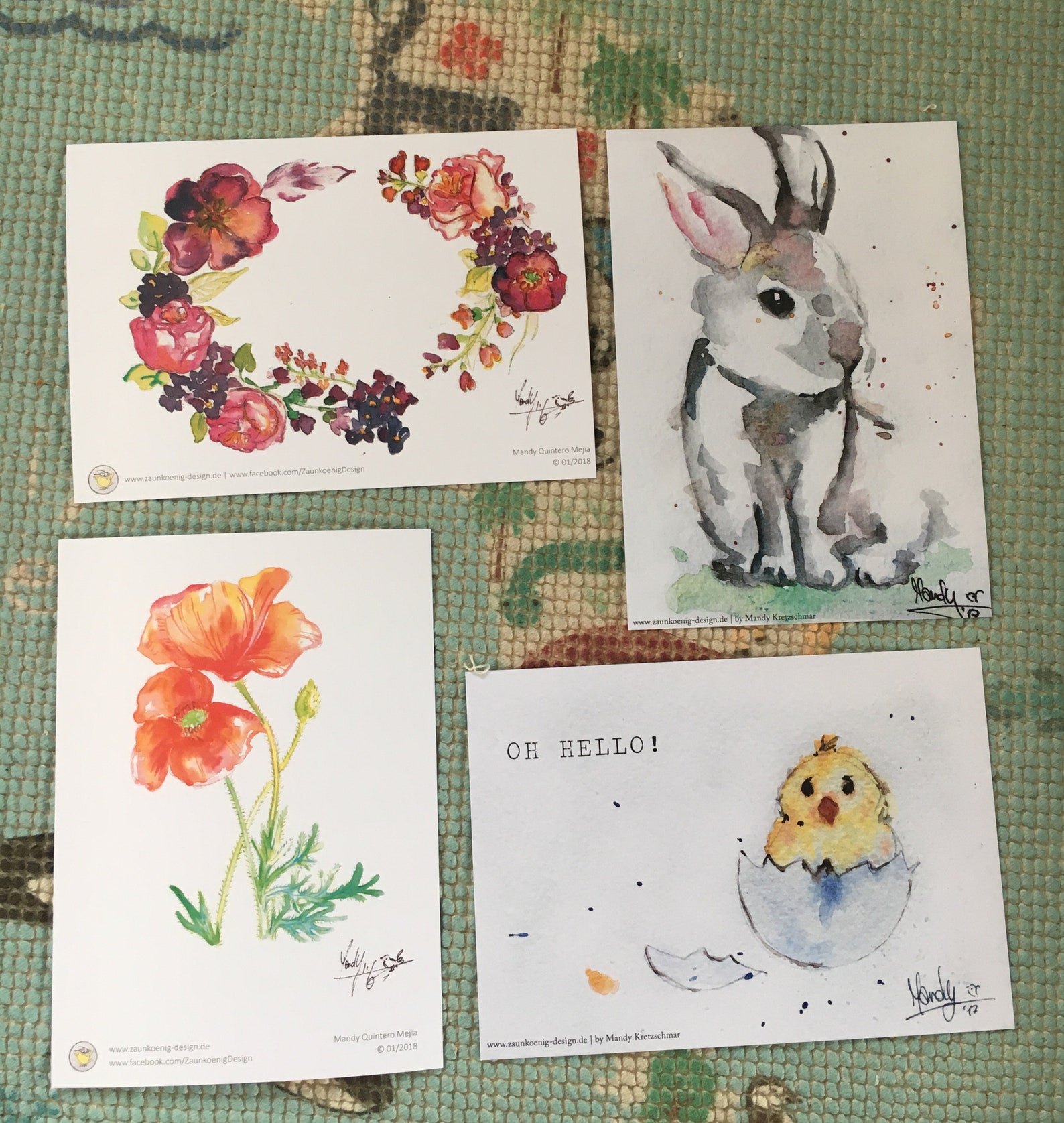 Sie sind mit Acrylfarbe bemalt. Du kannst wählen zwischen blau, orange, natur, mint oder rosa.