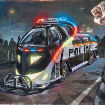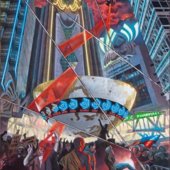 Als Chris mir erzählte, er wollte schon immer mal eine Geschichte über eine abstürzende Gesellschaft schreiben, dachte ich mir: Damit diese Geschichte lebendig wird, müsste man sie bebildern. Damit sie so glaubhaft wie möglich wird, müssten die Bilder fotorealistisch sein. Chris war sofort überzeugt, da er meinen Malstil schon schätzen gelernt hatte. Ich selber sah schon starke, wenn auch verschwommene Bilder vor meinem inneren Auge, und jetzt, 4 Jahre später, sind sie endlich voll ausgeformt und auf Papier gebannt.